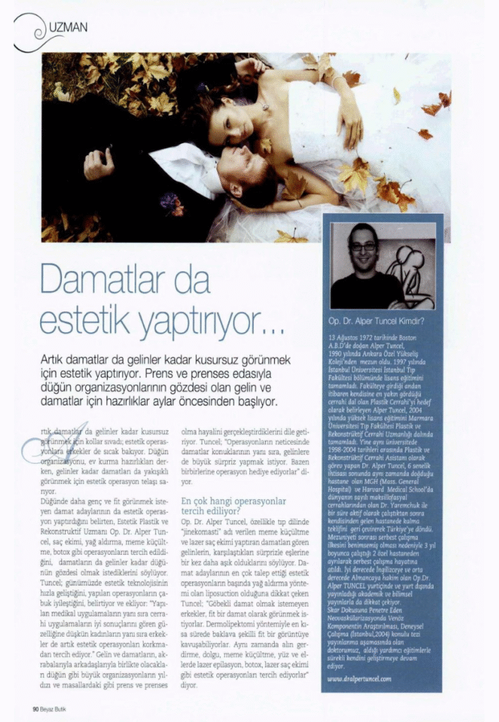 Düğünde daha genç ve fit görünmek isteyen damat adaylanının da estetik operasyon yaptırdığını belirten, Estetik Plastik ve Rekonstruktif Uzmanı Op. Dr. Alper Tuncel, saç ekimi, yağ aldırma, meme küçültme, botox gibi operasyonların tercih edildiğini, damatlanın da gelinler kadar düğünün gözdesi olmak istediklerini söylüyor.